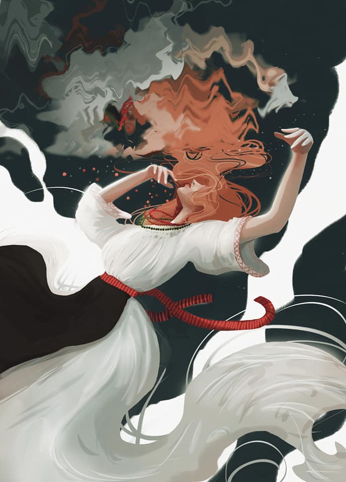 Девушка говорит, что все началось с обычной курсовой, темой которой оказались легенды города. Ей это показалось очень интересным подходом к творчеству. Ольга признается, что выбрала тему для души. Сначала она думала над тем как сделать эскизы и подать легенды в интересном виде. Художница решила, что должна показать три девушки у скал. Затем она подумала, что картина должна передавать всю суть, а именно дорогу смерти девушек, через эмоциональный фон. Ольга поэкспериментировала с различными стилями и методами и в результате пришла к интересной идеи. Художница показала на холсте девушек, которые летают, в частности с Ирвою это вторым рисунком. С помощью этого подхода на картине метко передана суть легенды. Третья картина должна быть связана с Мокосиевой.