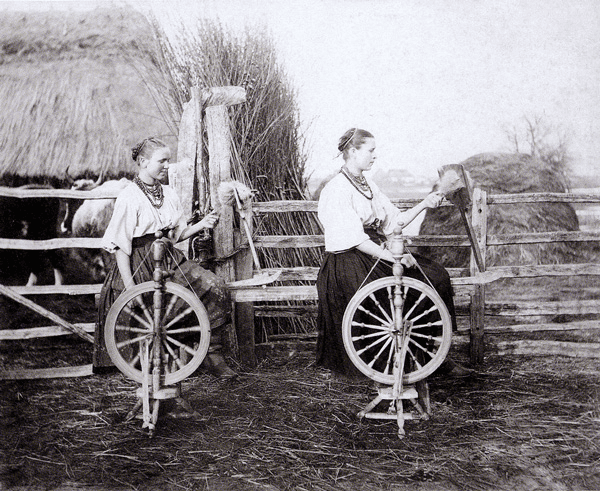 Пряли с помощью веретена намотав волокно в кудель. Техника из других стран, которая могла бы помочь в этом труде фактически отсутствовала. Немецкие прялки только набирали популярность. И не каждый имел средства на их покупку.