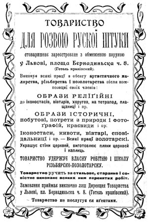 Цікавим є те, що товариством було організовано спеціальну робітню для всіх членів. Там виконувалися різного типу роботи з малярства, різьбярства і золотарства. Варто додати що Юліан Панкевич був співорганізатором виставок “Товариства для розвою руської штуки”. Вони проводилися у 1898, 1900 і 1903 роках. Невдовзі товариство занепало.
